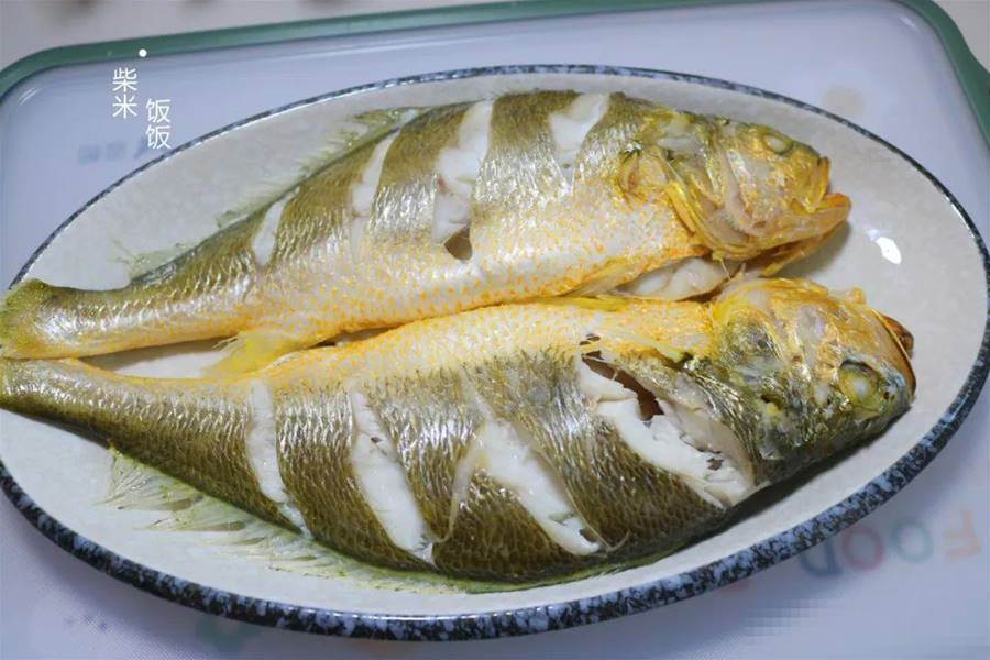 4,將泡好的黃魚取出來,用清水再沖洗一遍。瀝干水分后擺放在盤子里。